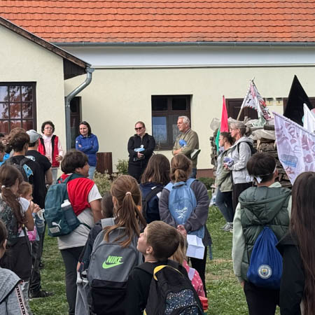 Pár mondatban beszélt a gyerekeknek Radnótiról, elmondta jövetele célját és a költő " Nem tudhatom " című versét.